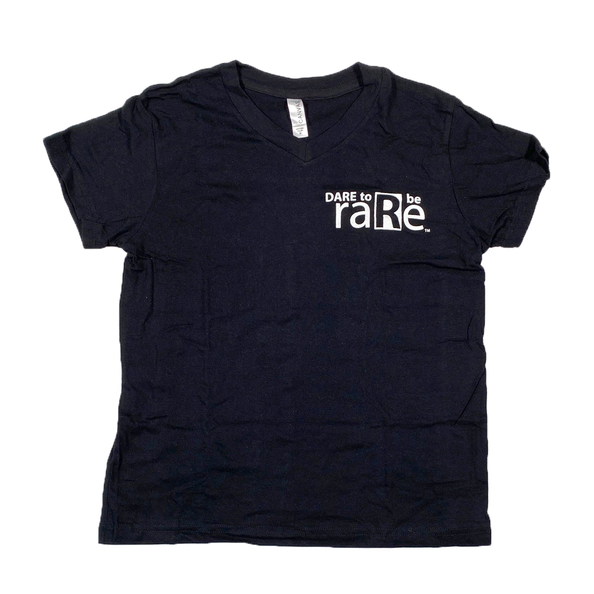 Our classic Dare to be Rare logo on the front chest, in white on black.