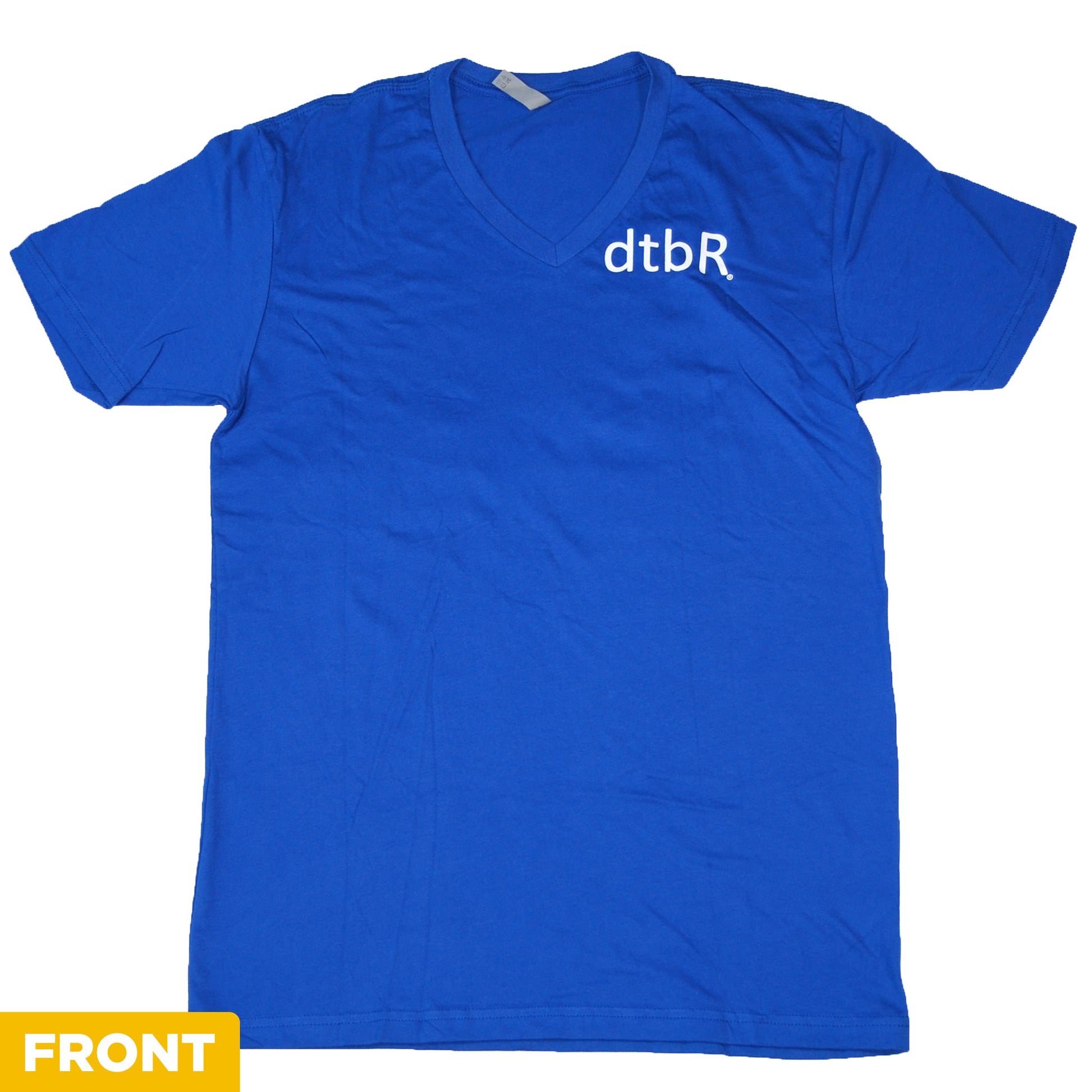 A royal blue shirt with a small white "dtbR" on the front and a large Dare to be Rare design on the back.