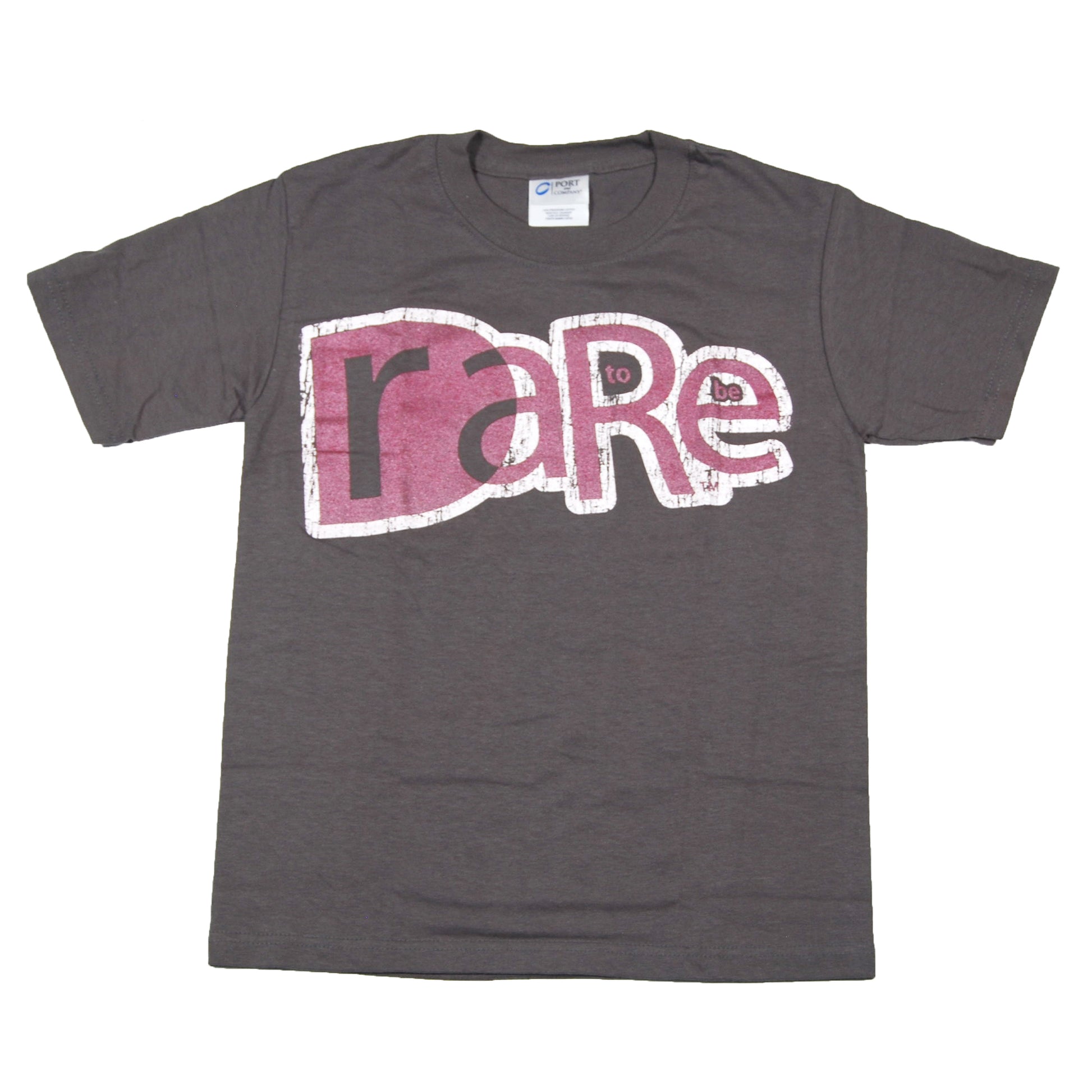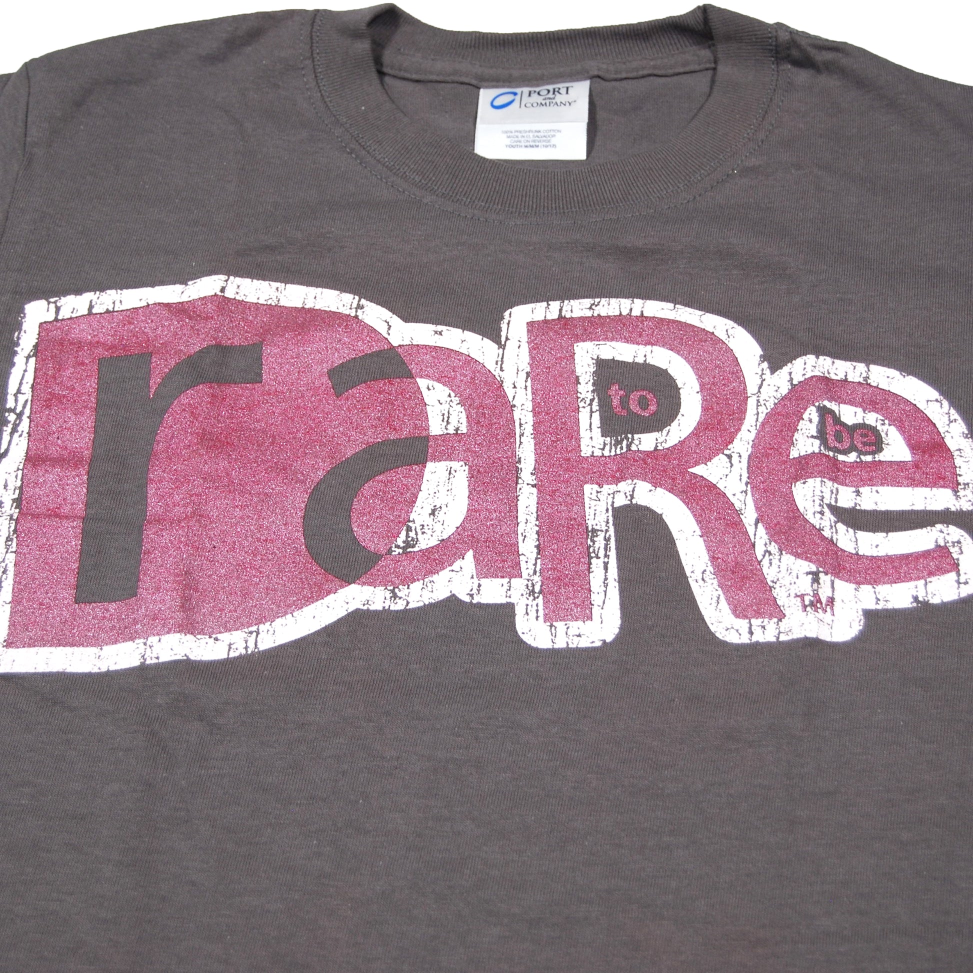 Dare to be Rare with this distressed pink & white logo on a grey crewneck shirt.
