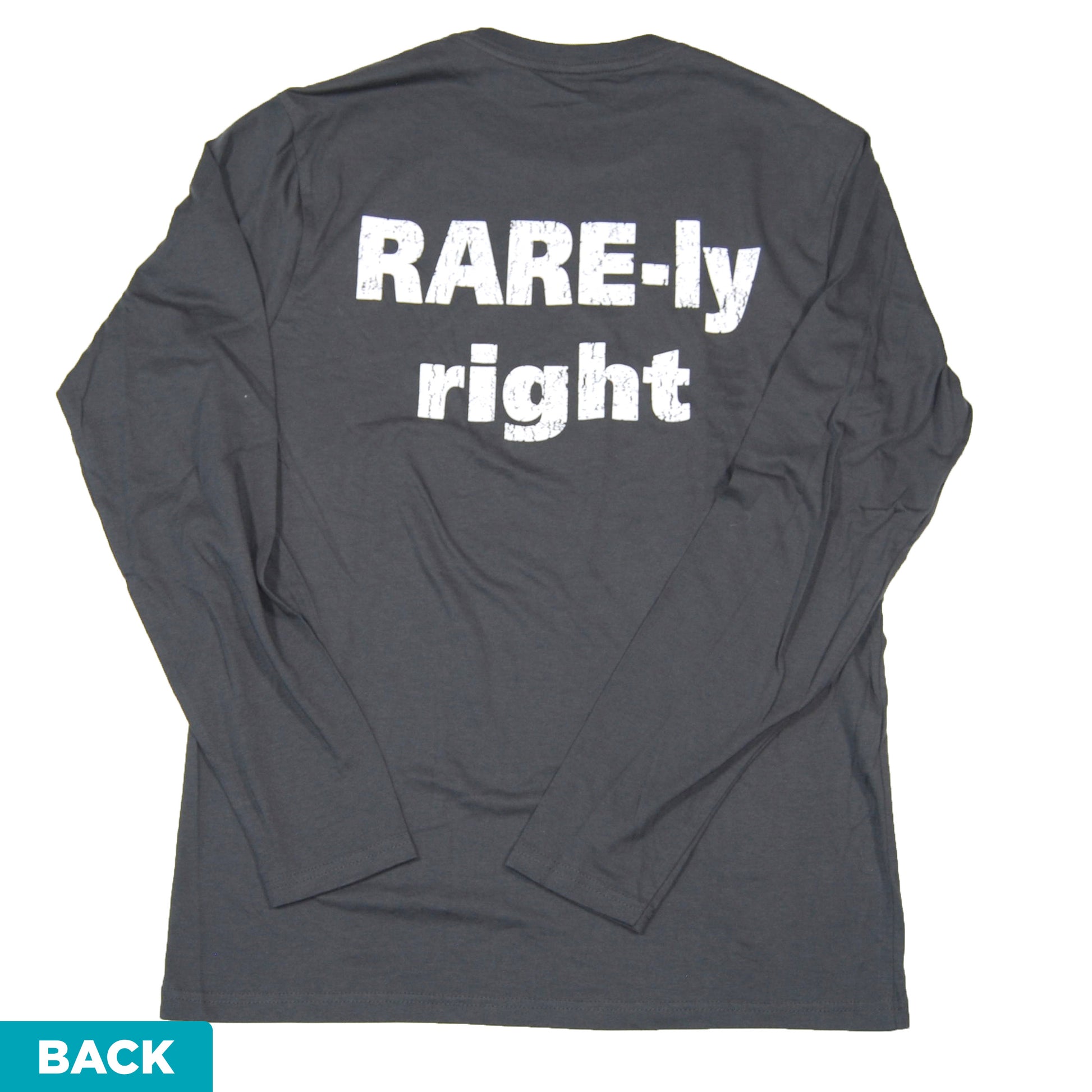For those who are rarely right, front-and-back white printing on a dark grey shirt.