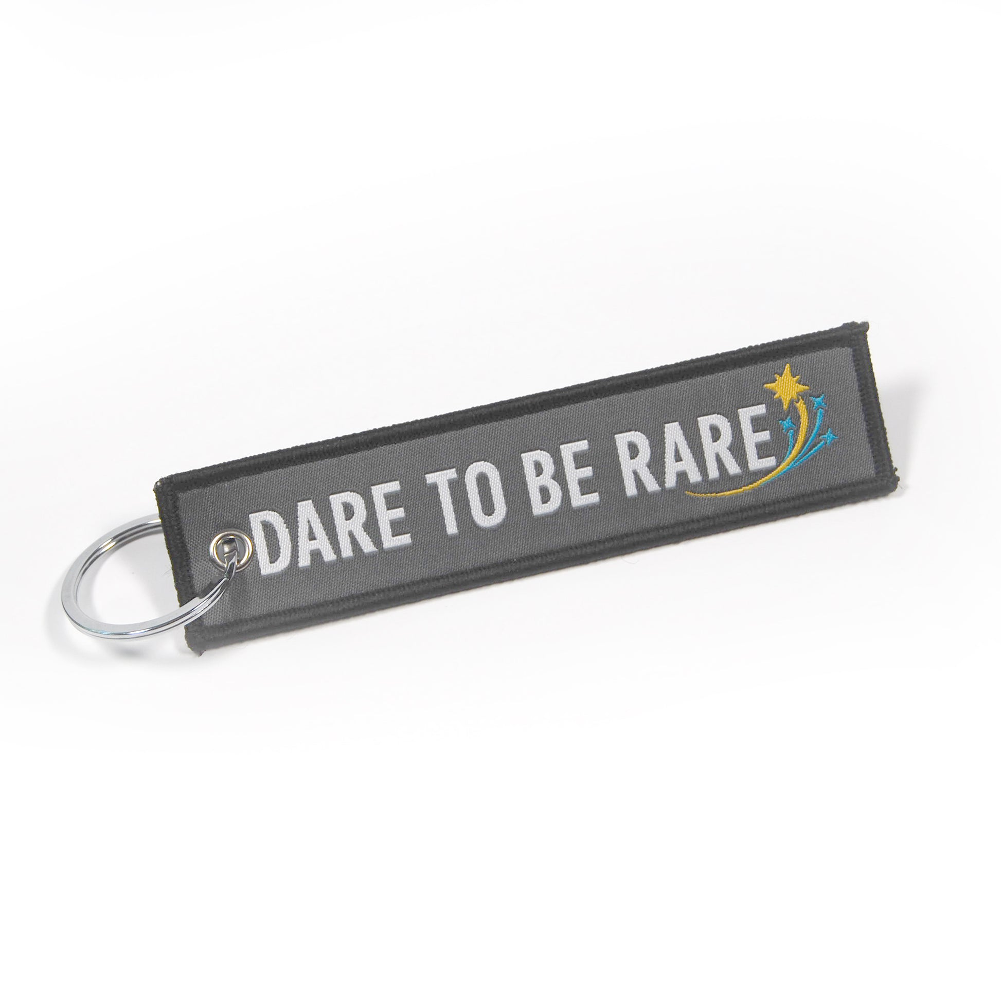 Our new shooting star Dare to be Rare logo embroidered on a dark grey keychain