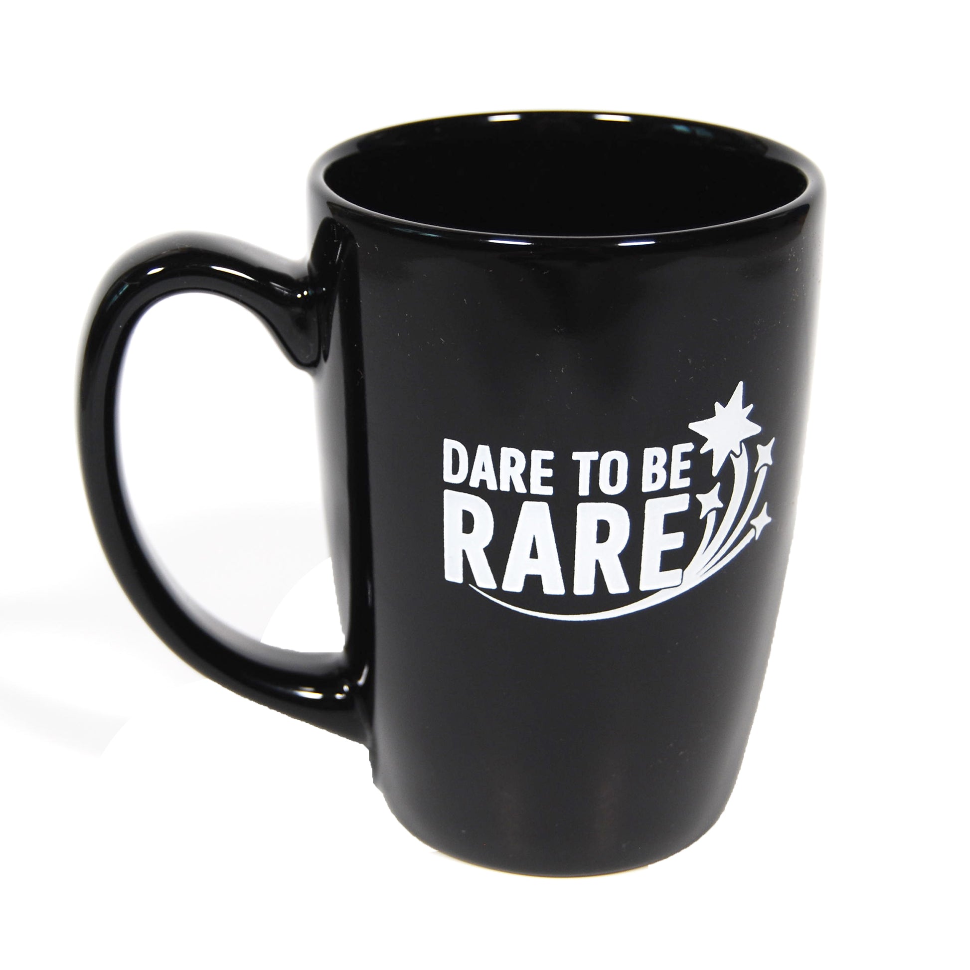 Our new shooting star Dare to be Rare logo printed in white on a black mug