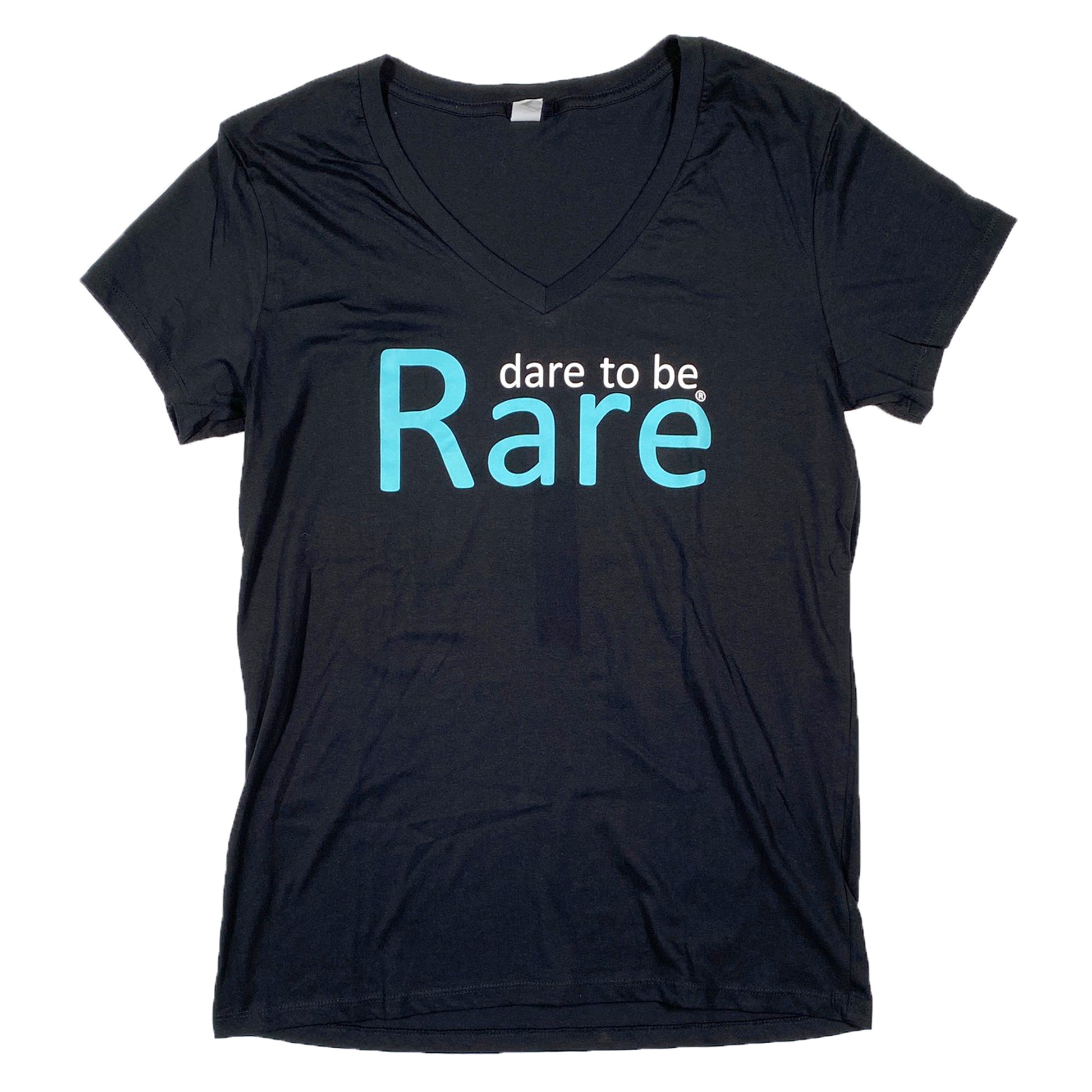 A large white & teal Dare to be Rare design on the front of a black shirt.